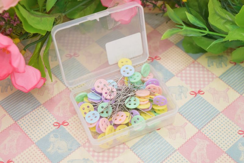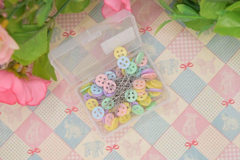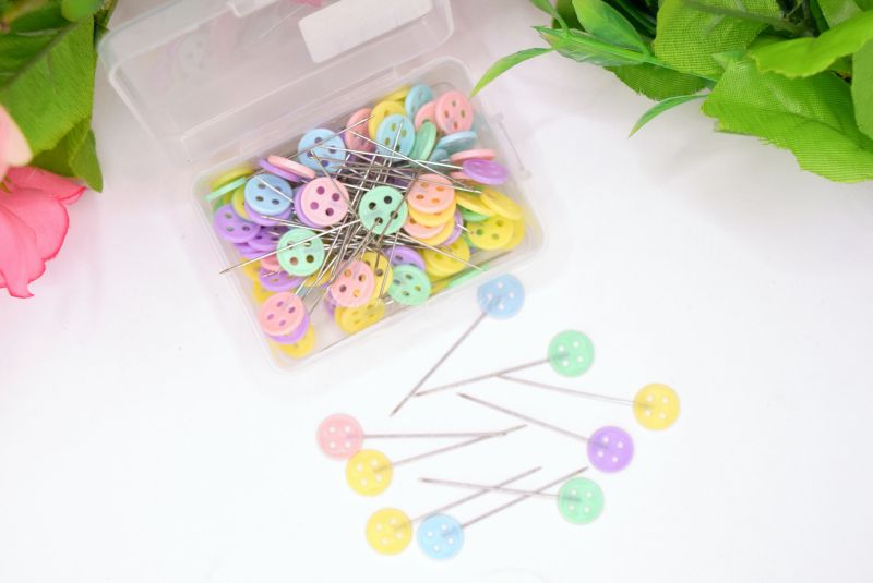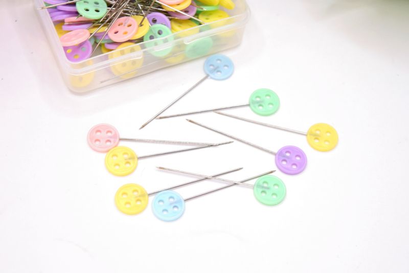 Портновские булавки из стали для шитья и рукоделия. Один конец острый, а на другом, - цветная головка в форме пуговички.