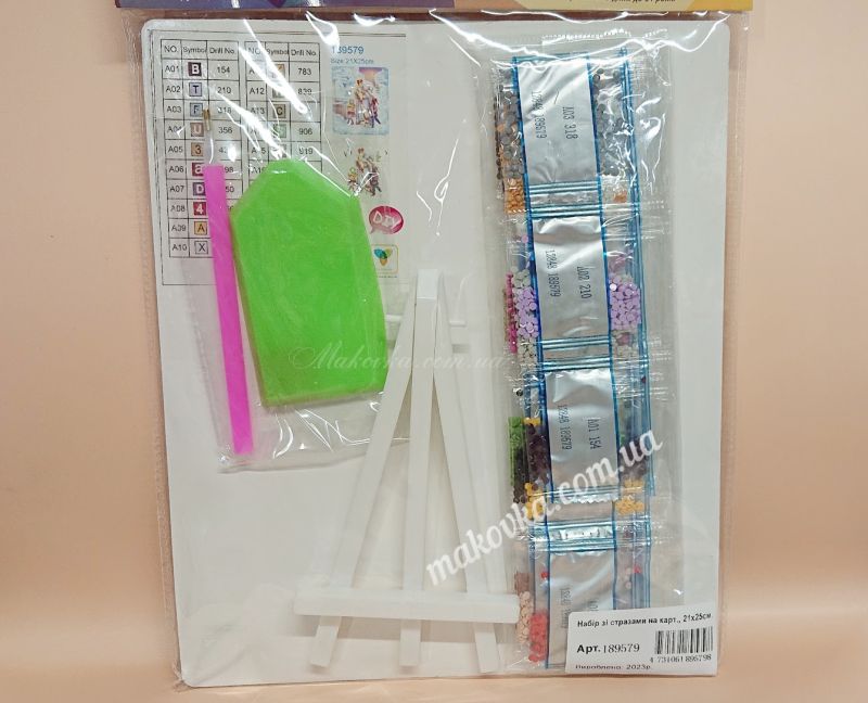 Состав: основа с клейкой поверхностью (частично или полностью), стразы, контейнер для страз, карандаш для страз, сухой клей, подставка мольберт.