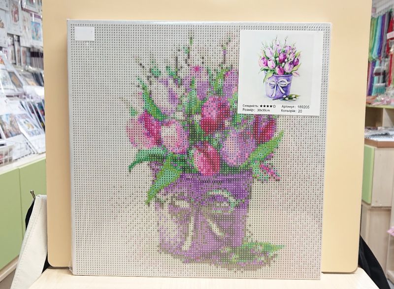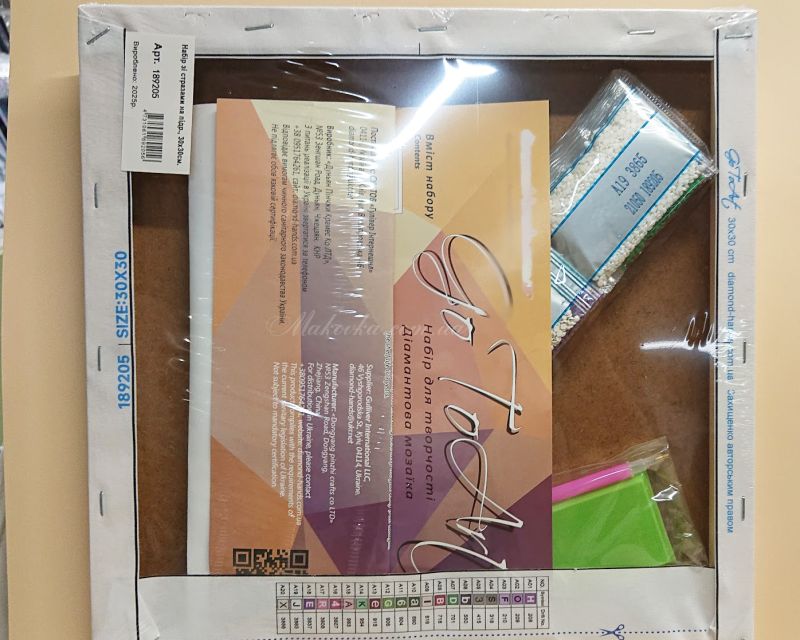 Состав: полотно с клеющимся основанием (или частично клеющимся), деревянный подрамник, стразы, контейнер для страз, карандаш для страз, сухой клей, инструкция по использованию.