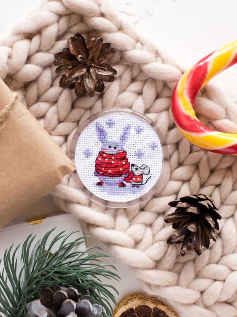 Забавная парочка - зайчик имышонок - магнит на холодильник. Вышивается нитками. Прекрасный небольшой подарок.