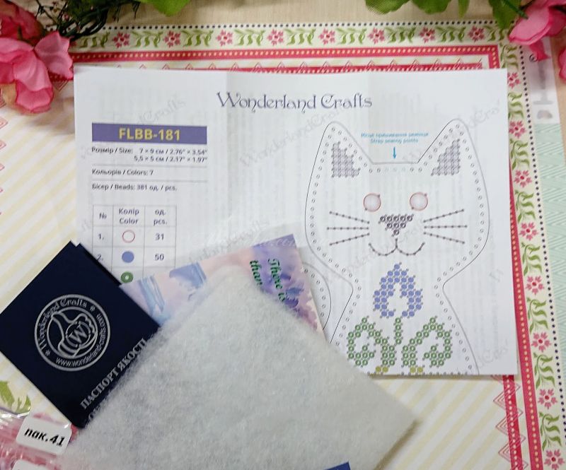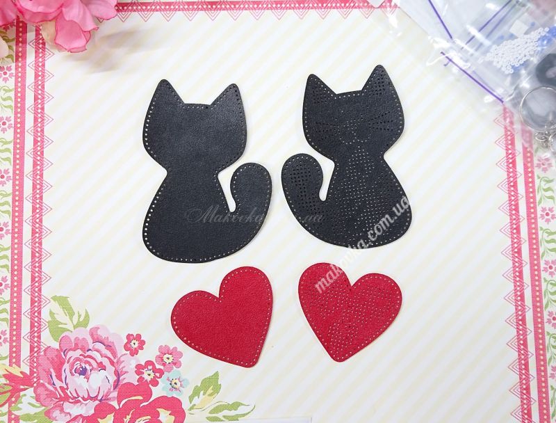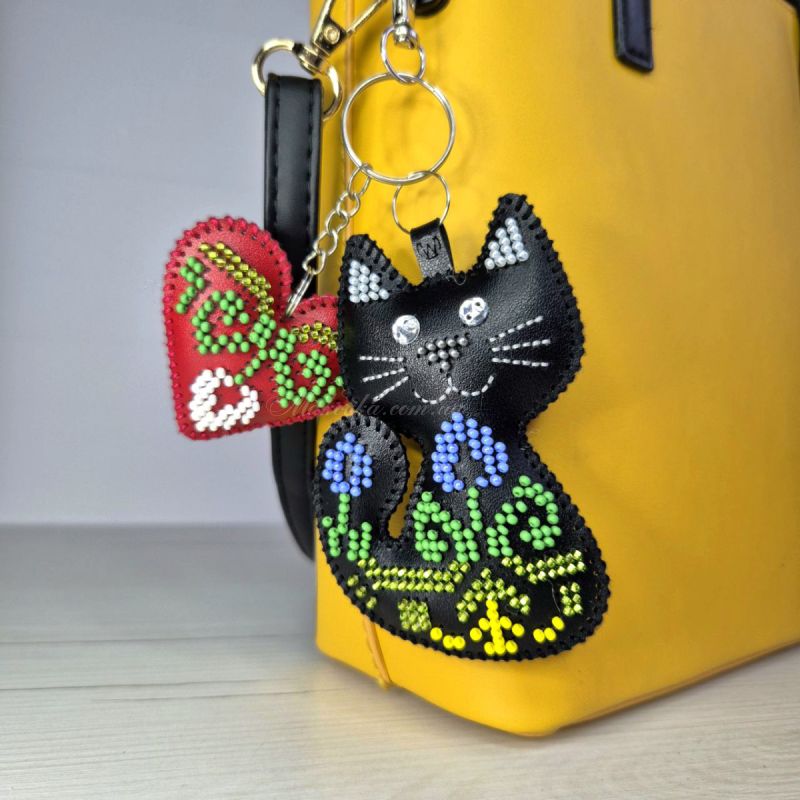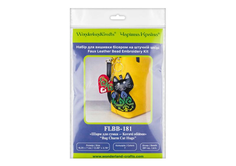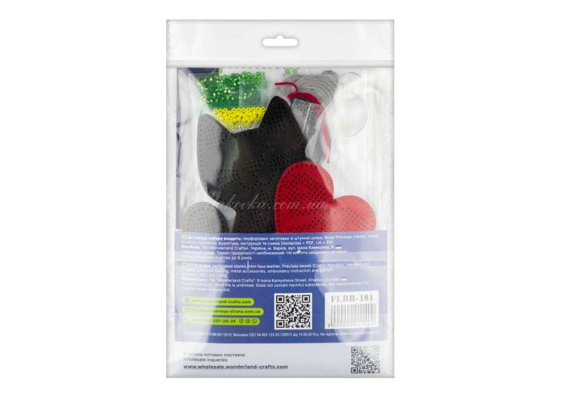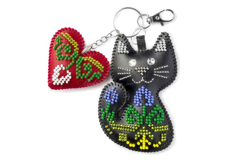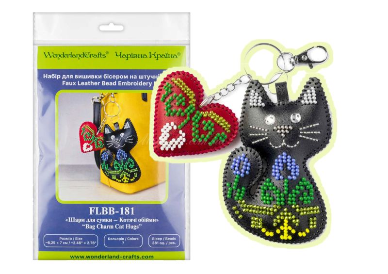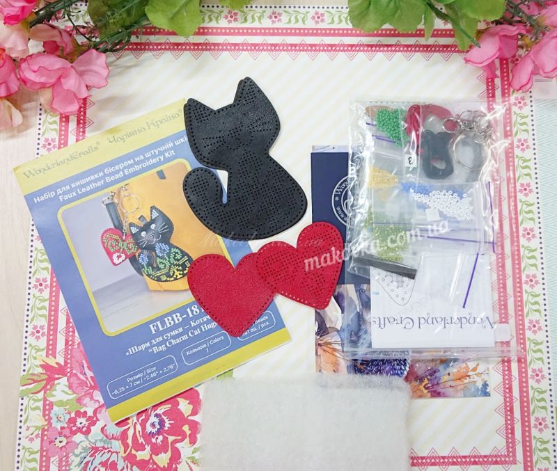 З набором «Котячі обійми» (FLBB-181) від Wonderland Crafts (Чарівна Країна) ви зможете власноруч вишити бісером стильний багатокомпонентний обвіс. Цей аксесуар складається з двох елементів: витонченого чорного котика, прикрашеного квітами, та яскравого червоного серця.