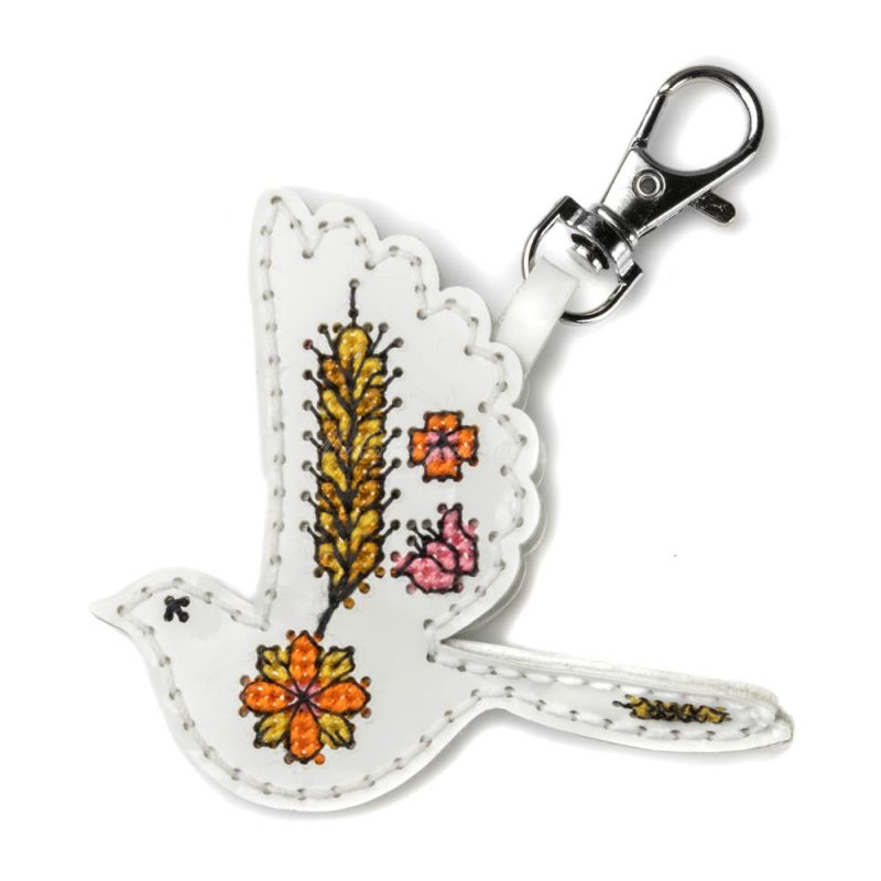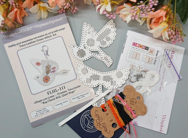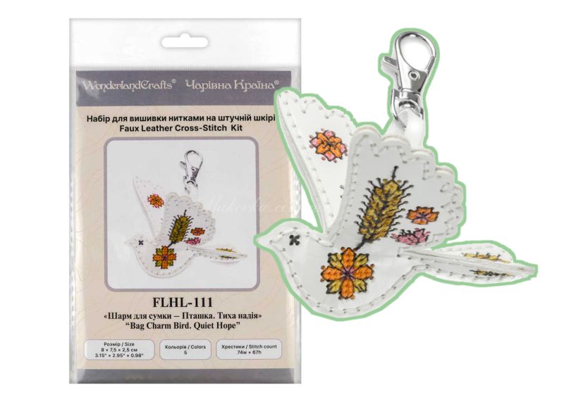 З набором «Пташка. Тиха надія» (FLHL-111) від Wonderland Crafts (Чарівна Країна) ви зможете власноруч створити витончений аксесуар - двосторонній шарм у формі птаха з вишитим візерунком із золотих колосків та квітів. Вишивка виконується на якісній штучній шкірі з уже нанесеною перфорацією, що гарантує ідеальну точність кожного стібка та задоволення від процесу.