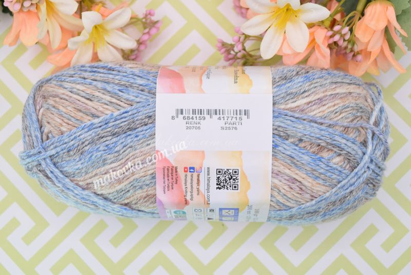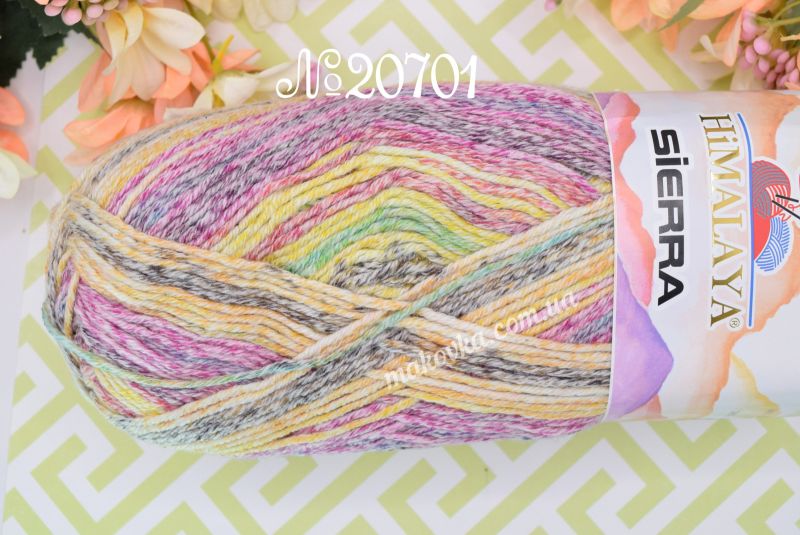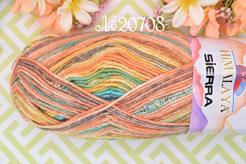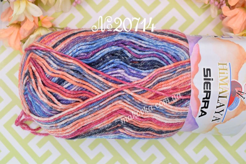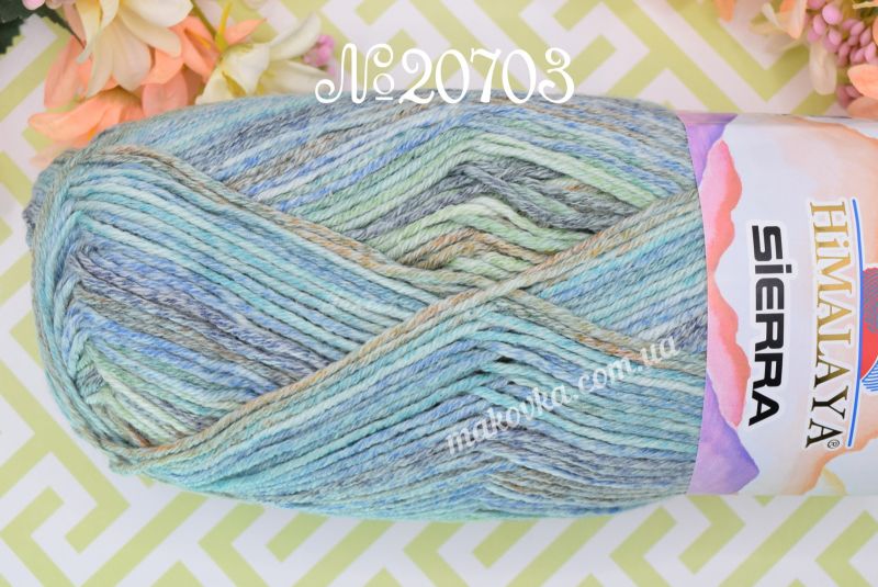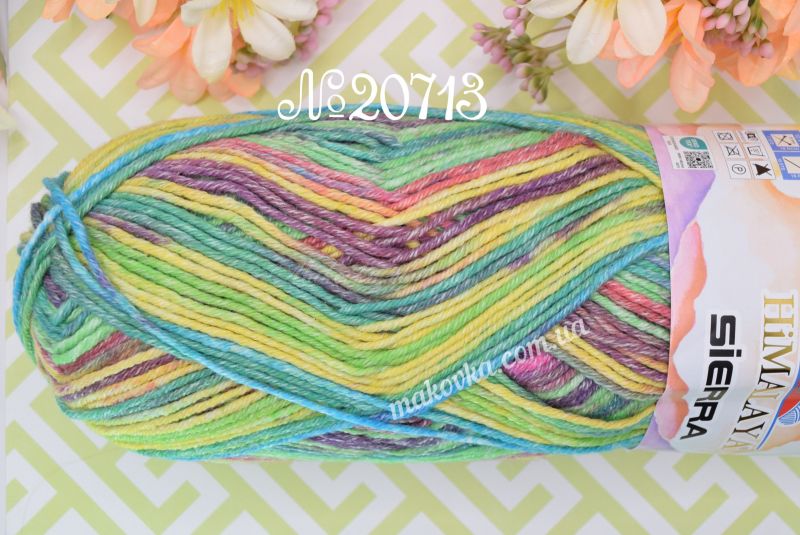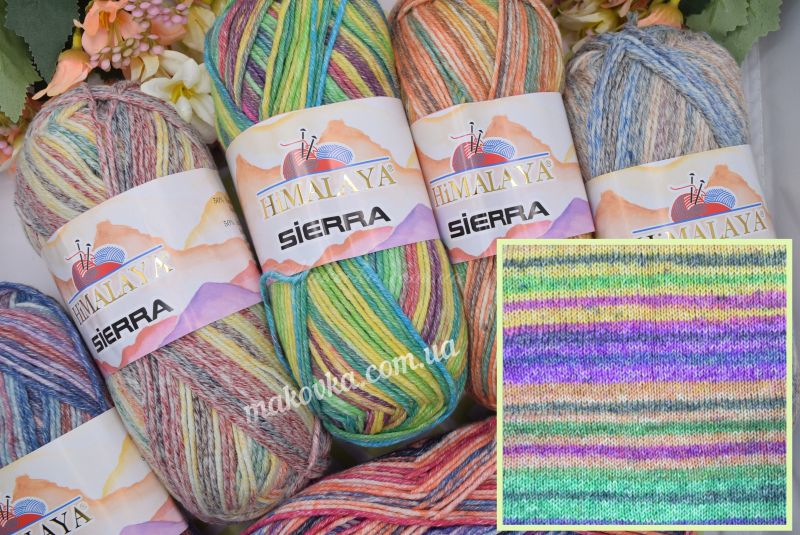 Пряжа Sierra Himalaya — це м’яка напівбавовняна нитка з яскравим секційним фарбуванням. Головна особливість цієї серії — контрастні кольорові переходи з ефектом легкої «потертості», що під час в’язання викладаються у чіткі, виразні смужки.