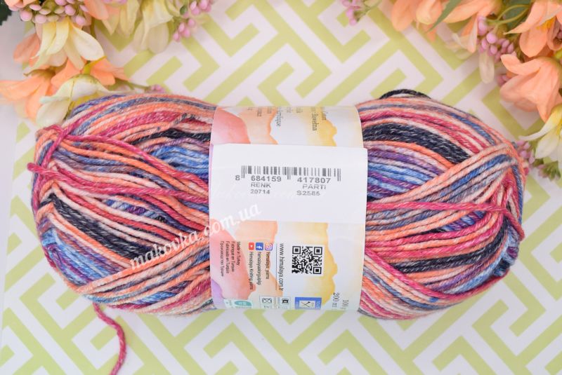 Нитка універсальна: вона ідеально лягає у полотно як при роботі спицями, так і гачком, створюючи самодостатній барвистий візерунок навіть у простій лицьовій гладі.