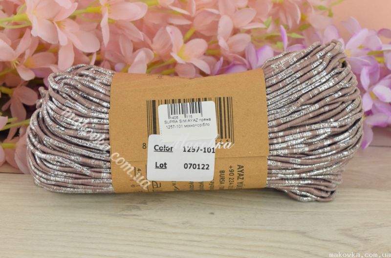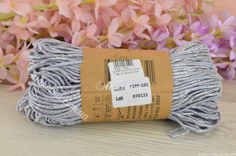 SUPRA SIM AYAZ - щільні круглі нитки (як шнур) з бавовни. Зверху нитки декоративна опплетка з поліестеру та люрексу. З цією пряжею легко працювати. Підійде для в'язання сумок, кошиків і різноманітних декоративних виробів.