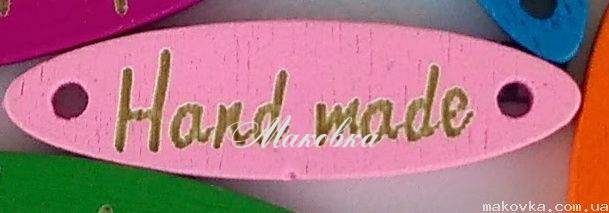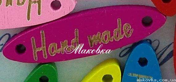 Маленькая деревянная нашивка-табличка овальной формы. Сделана из дерева. С надписью "хенд мейд".