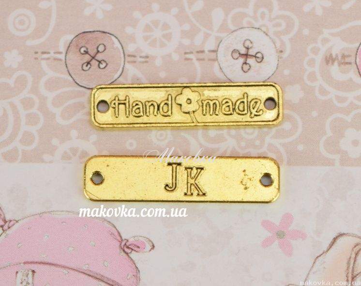 Маленька прямокутна металева нашивка - табличка, бирка, - написом "хенд мейд" англійською мовою. Має два отвори для пришивання до виробу.