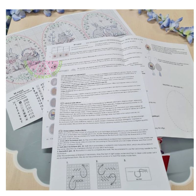 До набору Великдень на порозі М-0333 входить канва Аїда №16 лляного кольору, голка, інструкція, кольорова схема, муліне DMC на органайзері або на пластикових бобінах, холофайбер, шнур.