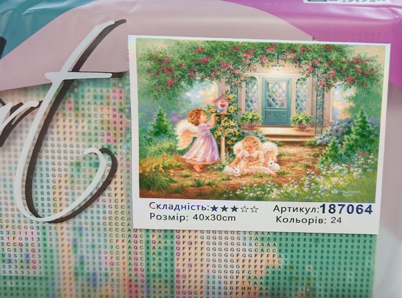 Відчуйте атмосферу тепла та безтурботності з набором для творчості від Go to Art. Сюжет картини переносить у квітучий сад, де маленькі янголята з ніжністю піклуються про пташок у шпаківні та пухнастих кроликів біля затишного блакитного будиночка.